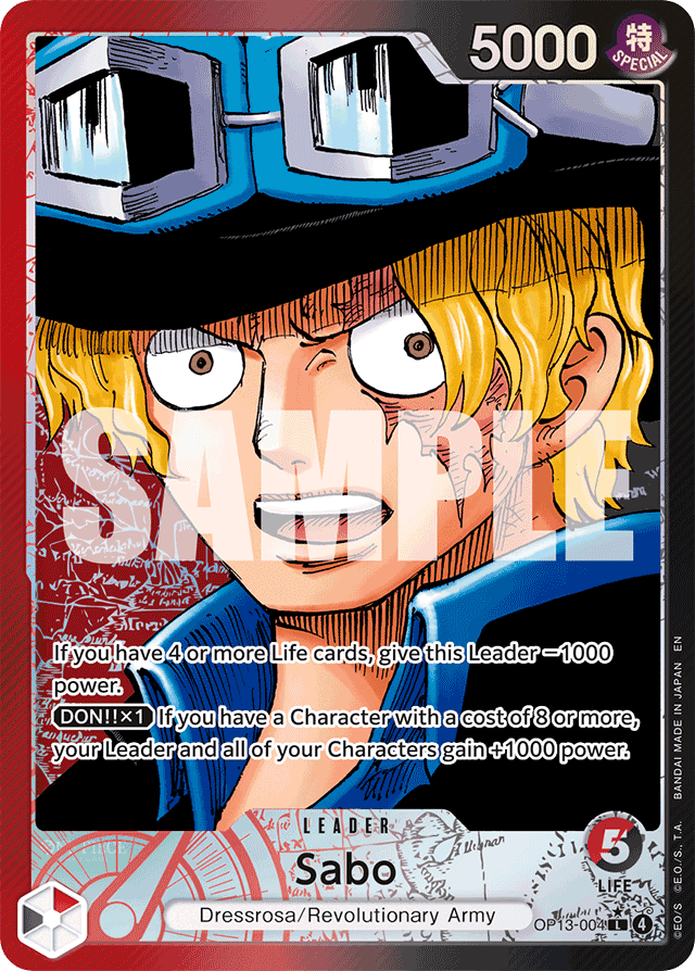 If you have 4 or more Life cards, give this Leader −1000 power. [DON!! x1] If you have a Character with a cost of 8 or more, your Leader and all of your Characters gain +1000 power.
