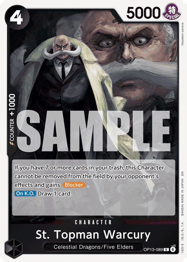 If you have 7 or more cards in your trash, this Character cannot be removed from the field by your opponent's effects and gains [Blocker]. [On K.O.] Draw 1 card.