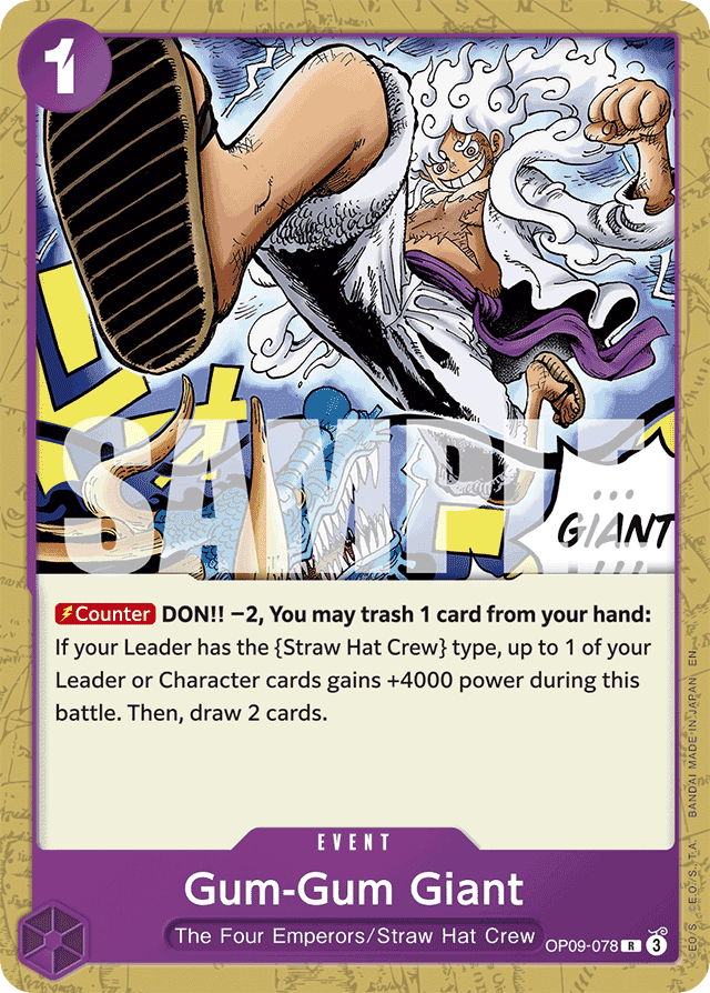 [Counter] DON!! −2, You may trash 1 card from your hand: If your Leader has the {Straw Hat Crew} type, up to 1 of your Leader or Character cards gains +4000 power during this battle. Then, draw 2 cards.
