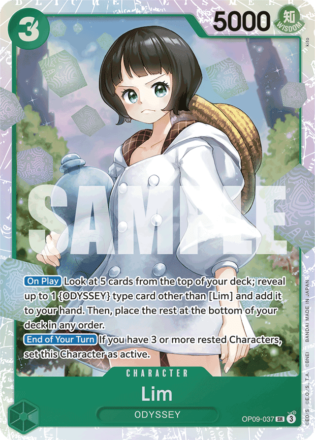 [On Play] Look at 5 cards from the top of your deck; reveal up to 1 {ODYSSEY} type card other than [Lim] and add it to your hand. Then, place the rest at the bottom of your deck in any order. [End of Your Turn] If you have 3 or more rested Characters, set this Character as active.
