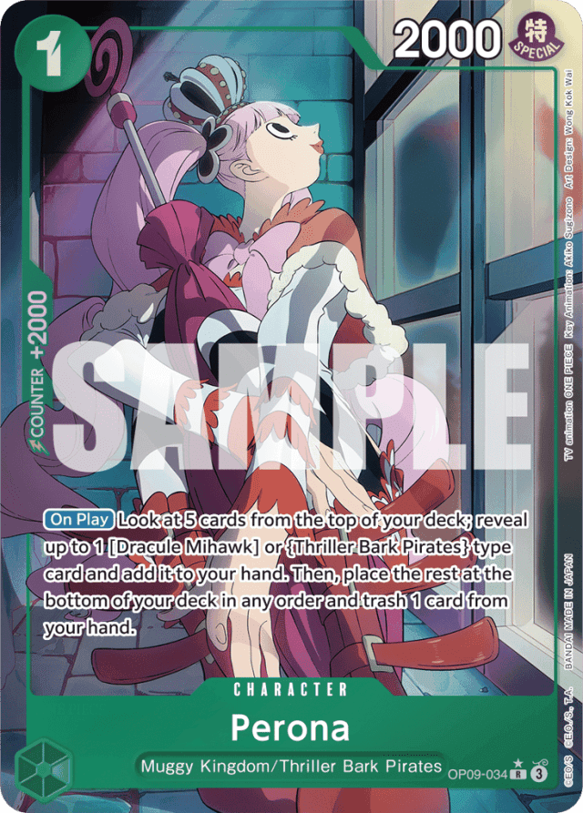 [On Play] Look at 5 cards from the top of your deck; reveal up to 1 [Dracule Mihawk] or {Thriller Bark Pirates} type card and add it to your hand. Then, place the rest at the bottom of your deck in any order and trash 1 card from your hand.