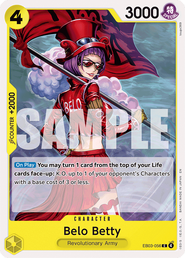 [On Play] You may turn 1 card from the top of your Life cards face-up: K.O. up to 1 of your opponent's Characters with a base cost of 3 or less.