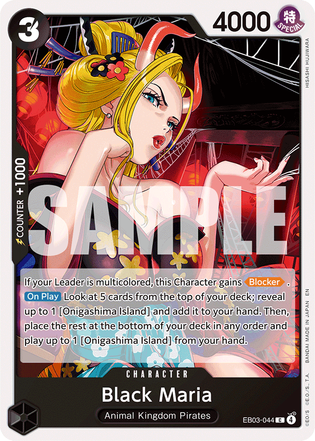 If your Leader is multicolored, this Character gains [Blocker]. [On Play] Look at 5 cards from the top of your deck; reveal up to 1 [Onigashima Island] and add it to your hand. Then, place the rest at the bottom of your deck in any order and play up to 1 [Onigashima Island] from your hand.