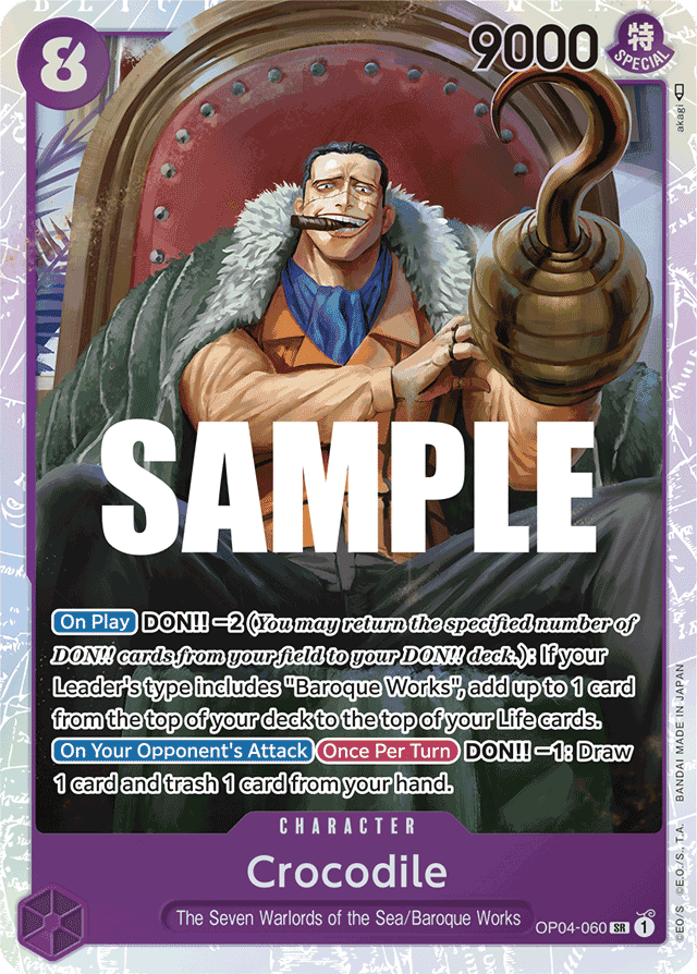 [On Play] DON!! −2 (You may return the specified number of DON!! cards from your field to your DON!! deck.): If your Leader's type includes "Baroque Works", add up to 1 card from the top of your deck to the top of your Life cards. [On Your Opponent's Attack] [Once Per Turn] DON!! −1: Draw 1 card and trash 1 card from your hand.