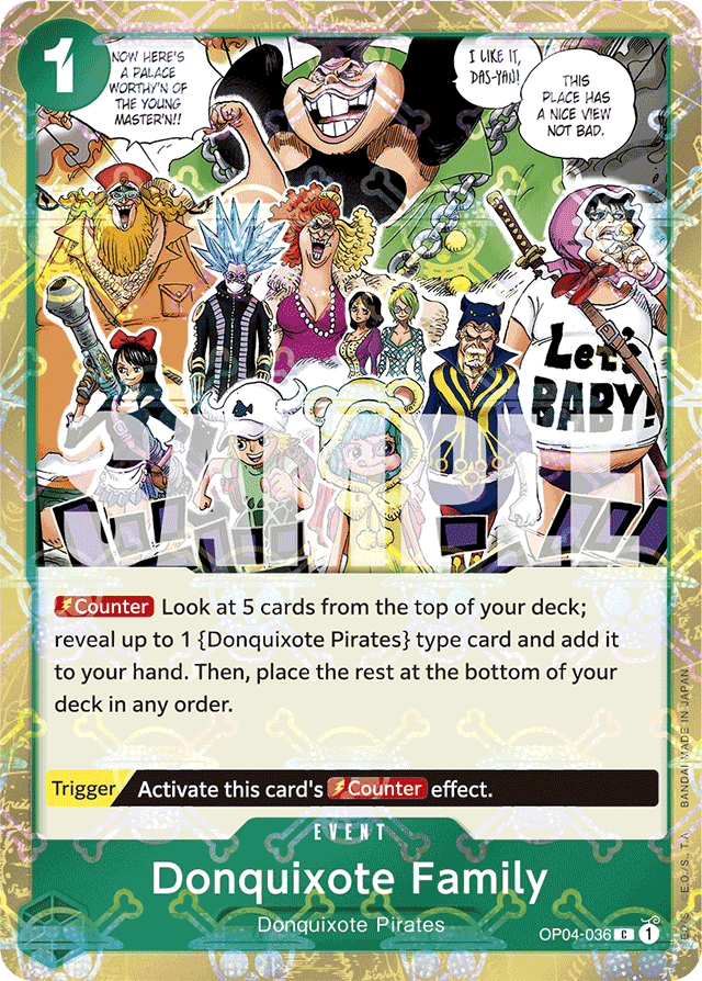 [Counter] Look at 5 cards from the top of your deck; reveal up to 1 {Donquixote Pirates} type card and add it to your hand. Then, place the rest at the bottom of your deck in any order. [Trigger] Activate this card's [Counter] effect.