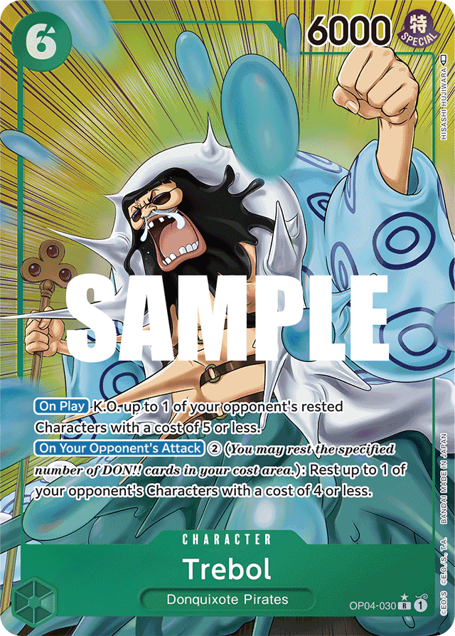 [On Play] K.O. up to 1 of your opponent's rested Characters with a cost of 5 or less. [On Your Opponent's Attack] ➁ (You may rest the specified number of DON!! cards in your cost area.): Rest up to 1 of your opponent's Characters with a cost of 4 or less.