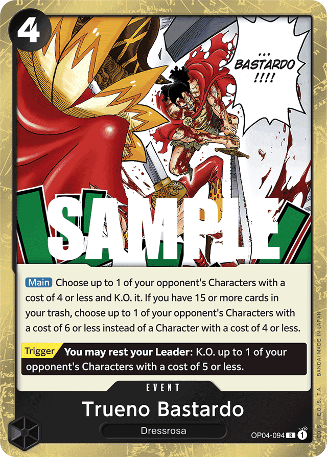 [Main] Choose up to 1 of your opponent's Characters with a cost of 4 or less and K.O. it. If you have 15 or more cards in your trash, choose up to 1 of your opponent's Characters with a cost of 6 or less instead of a Character with a cost of 4 or less. [Trigger] You may rest your Leader: K.O. up to 1 of your opponent's Characters with a cost of 5 or less.