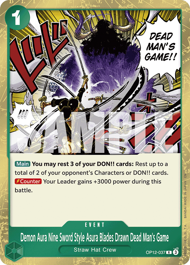 [Main] You may rest 3 of your DON!! cards: Rest up to a total of 2 of your opponent's Characters or DON!! cards. [Counter] Your Leader gains +3000 power during this battle.