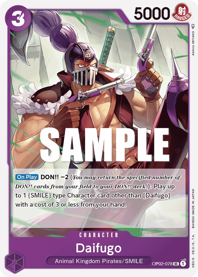[On Play] DON!! ?2 (You may return the specified number of DON!! cards from your field to your DON!! deck.): Play up to 1 {SMILE} type Character card other than [Daifugo] with a cost of 3 or less from your hand.