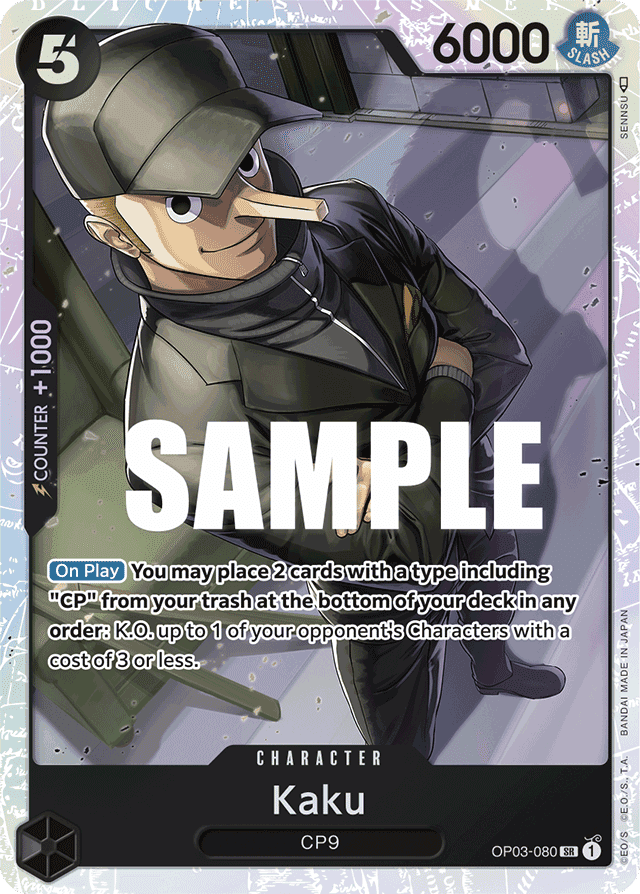 [On Play] You may place 2 cards with a type including "CP" from your trash at the bottom of your deck in any order: K.O. up to 1 of your opponent's Characters with a cost of 3 or less.