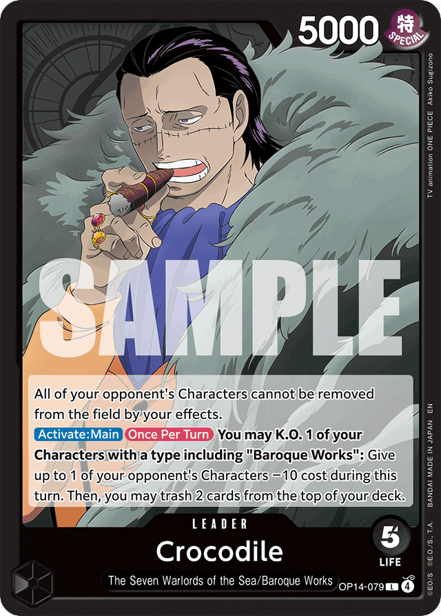 None of your opponent's Characters can leave the field due to your effects. [Activate: Main] [Once Per Turn] You may K.O. 1 of your Characters with a type including "Baroque Works": Give up to 1 of your opponent's Characters −10 cost during this turn. Then, you may trash 2 cards from the top of your deck.