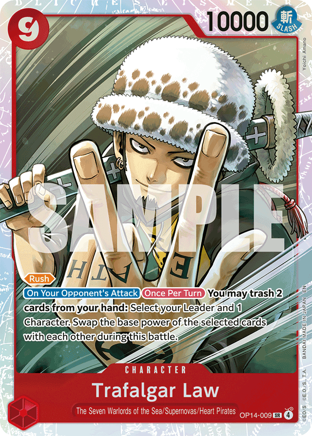 [Rush] [On Your Opponent's Attack] [Once Per Turn] You may trash 2 cards from your hand: Choose your Leader and 1 Character. Swap the original power of each chosen card during this battle.