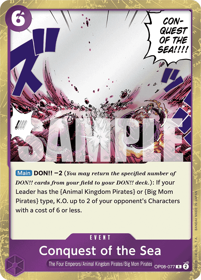 [Main] DON!! −2 (You may return the specified number of DON!! cards from your field to your DON!! deck.): If your Leader has the {Animal Kingdom Pirates} or {Big Mom Pirates} type, K.O. up to 2 of your opponent's Characters with a cost of 6 or less.