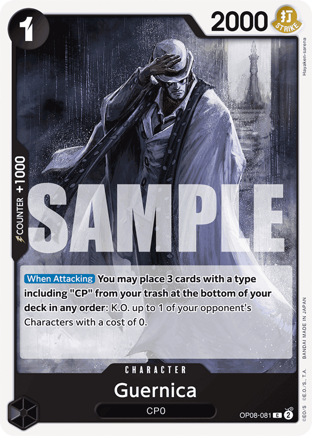 [When Attacking] You may place 3 cards with a type including "CP" from your trash at the bottom of your deck in any order: K.O. up to 1 of your opponent's Characters with a cost of 0.