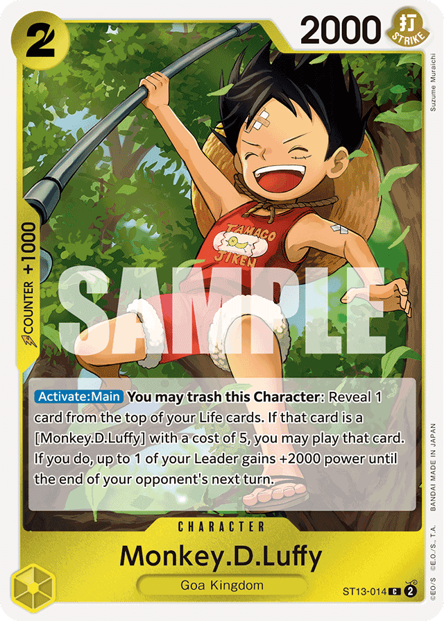 [Activate: Main] You may trash this Character: Reveal 1 card from the top of your Life cards. If that card is a [Monkey.D.Luffy] with a cost of 5, you may play that card. If you do, up to 1 of your Leader gains +2000 power until the end of your opponent's next turn.