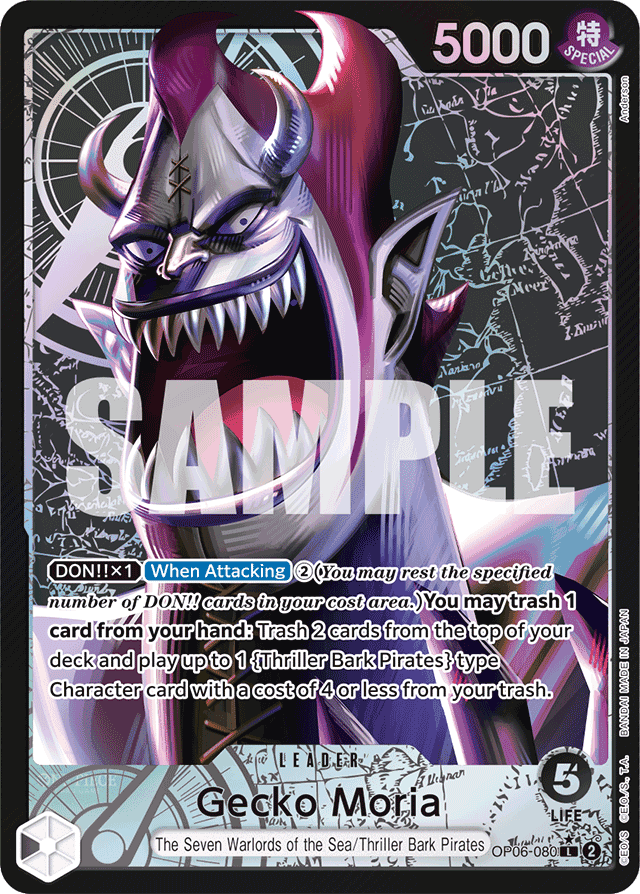 [DON!! x1] [When Attacking] You may rest 2 of your DON!! cards and trash 1 card from your hand: Trash 2 cards from the top of your deck and play up to 1 {Thriller Bark Pirates} type Character card with a cost of 4 or less from your trash.
