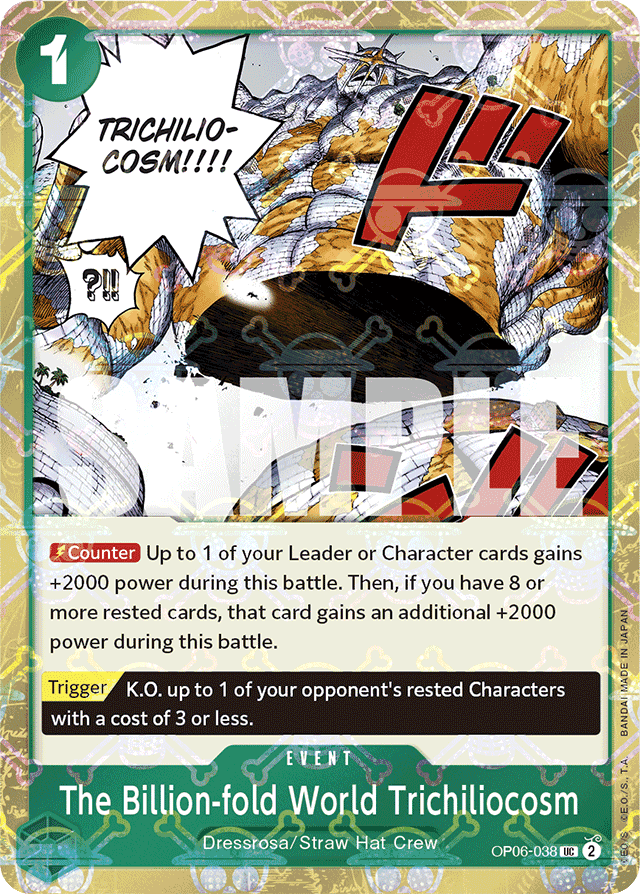 [Counter] Up to 1 of your Leader or Character cards gains +2000 power during this battle. Then, if you have 8 or more rested cards, that card gains an additional +2000 power during this battle. [Trigger] K.O. up to 1 of your opponent's rested Characters with a cost of 3 or less.