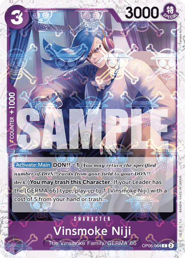 [Activate: Main] DON!! −1 (You may return the specified number of DON!! cards from your field to your DON!! deck.) You may trash this Character: If your Leader has the {GERMA 66} type, play up to 1 [Vinsmoke Niji] with a cost of 5 from your hand or trash.