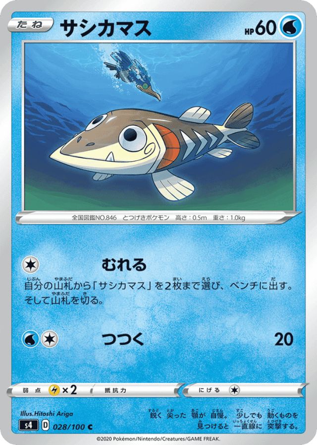 FlockCost: 1自分の山札から「サシカマス」を2枚まで選び、ベンチに出す。そして山札を切る。