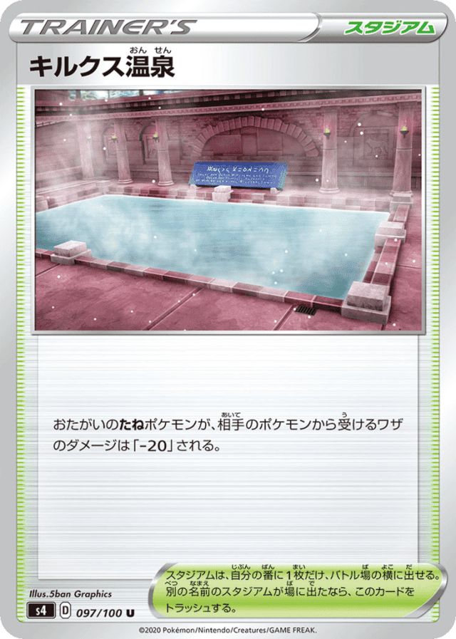 おたがいのたねポケモンが、相手のポケモンから受けるワザのダメージは「-20」される。 スタジアムは、自分の番に1枚だけ、バトル場の横に出せる。別の名前のスタジアムが場に出たなら、このカードをトラッシュする。