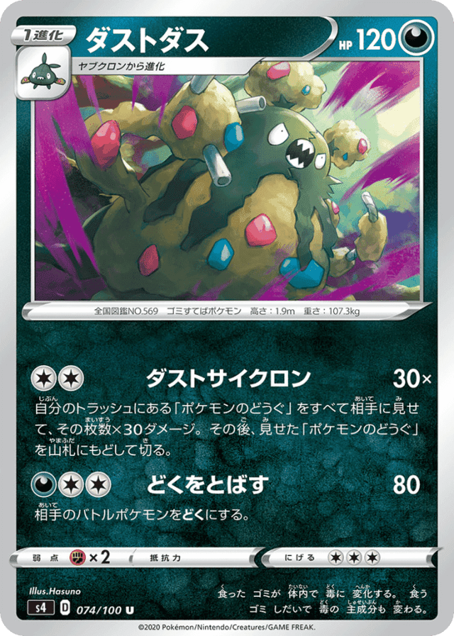 Trash Cyclone30×Cost: 2自分のトラッシュにある「ポケモンのどうぐ」をすべて相手に見せて、その枚数×30ダメージ。その後、見せた「ポケモンのどうぐ」を山札にもどして切る。