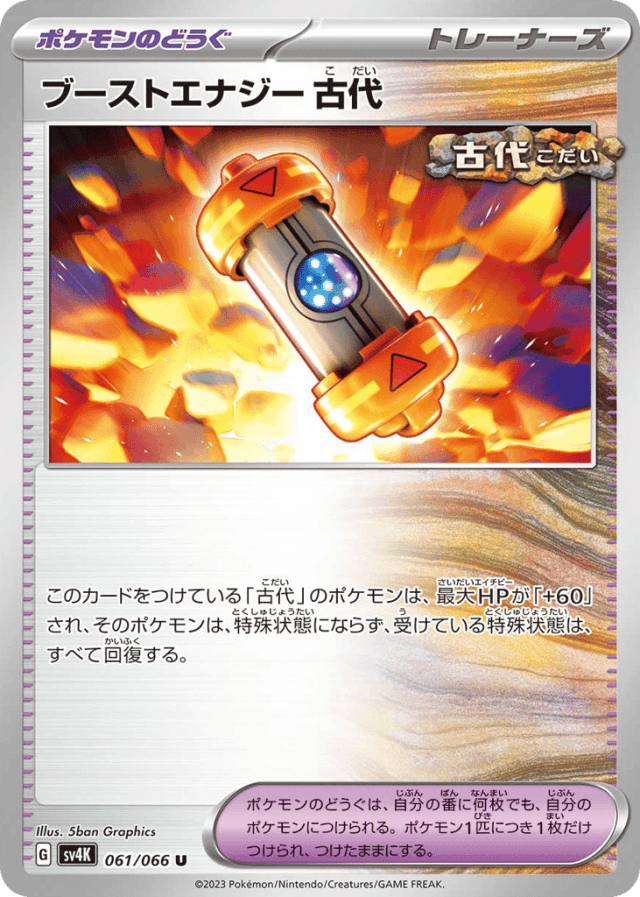 このカードをつけている「古代」のポケモンは、最大HPが「+60」され、そのポケモンは、特殊状態にならず、受けている特殊状態は、すべて回復する。