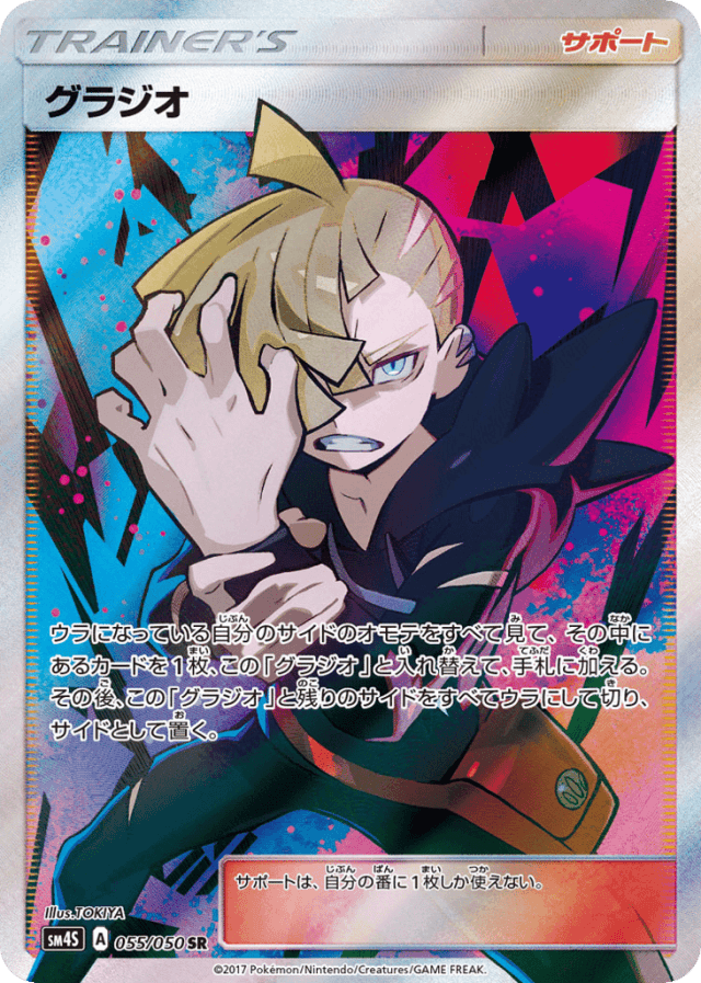 - ウラになっている自分のサイドのオモテをすべて見て、その中にあるカードを1枚、この「グラジオ」と入れ替えて、手札に加える。その後、この「グラジオ」と残りのサイドをすべてウラにして切り、サイドとして置く。 — サポートは、自分の番に1枚しか使えない。