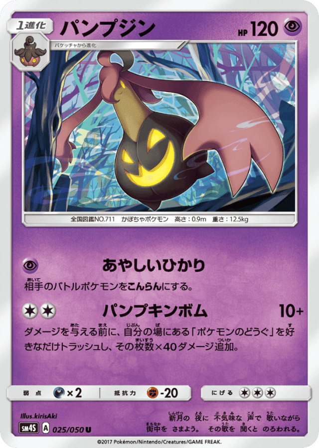 Pumpkin Bomb10+Cost: 2ダメージを与える前に、自分の場にある「ポケモンのどうぐ」を好きなだけトラッシュし、その枚数×40ダメージ追加。