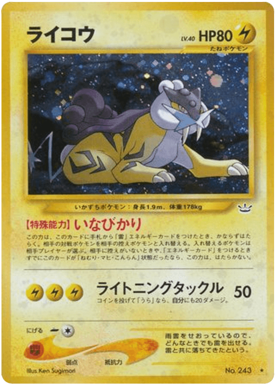 Whenever you attach a Lightning Energy card from your hand to Raikou, if your opponent has any Benched Pokémon, he or she chooses 1 of them and switches it with the Defending Pokémon. This power stops working while Raikou is Asleep, Confused, or Paralyzed.