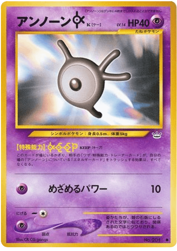 Your opponent's attacks, Pokémon Powers, and Trainer cards can't discard Energy cards from your Pokémon with Unown in their names. (Any other effects still happen.)