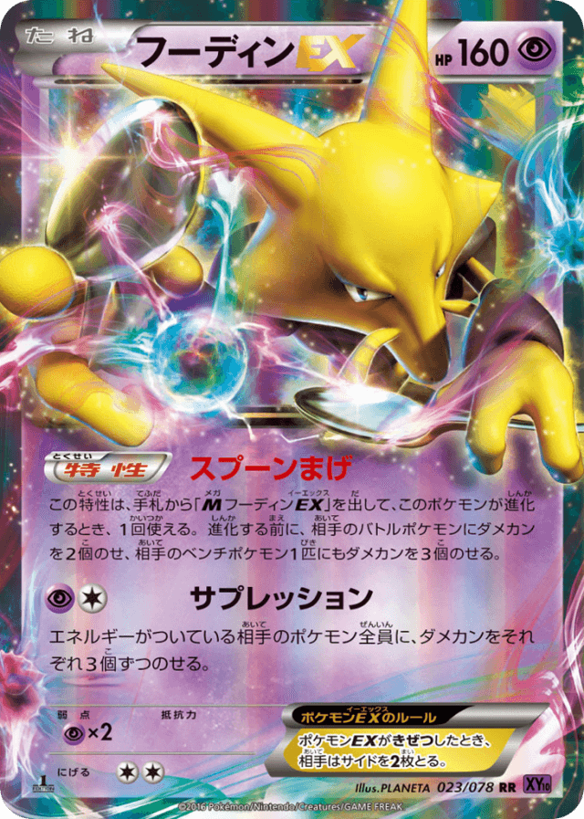 Kinesisこの特性は、手札から「<span class="pcg pcg-megamark"></span>フーディンEX」を出して、このポケモンが進化するとき、1回使える。進化する前に、相手のバトルポケモンにダメカンを2個のせ、相手のベンチポケモン1匹にもダメカンを3個のせる。