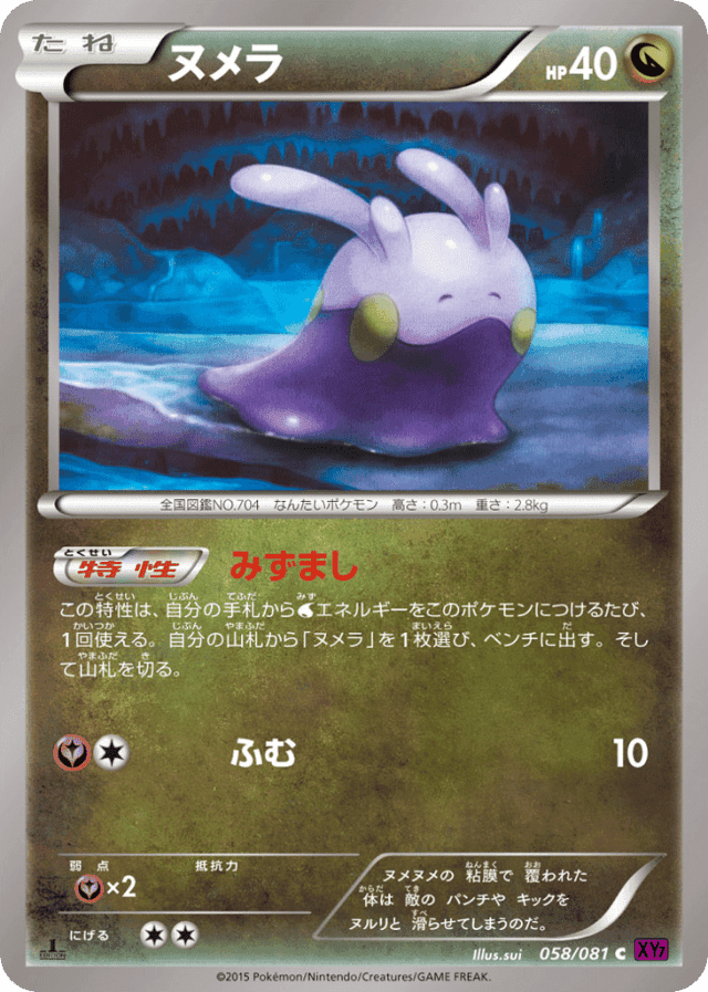 Water Downこの特性は、自分の手札からWaterエネルギーをこのポケモンにつけるたび、1回使える。自分の山札から「ヌメラ」を1枚選び、ベンチに出す。そして山札を切る。