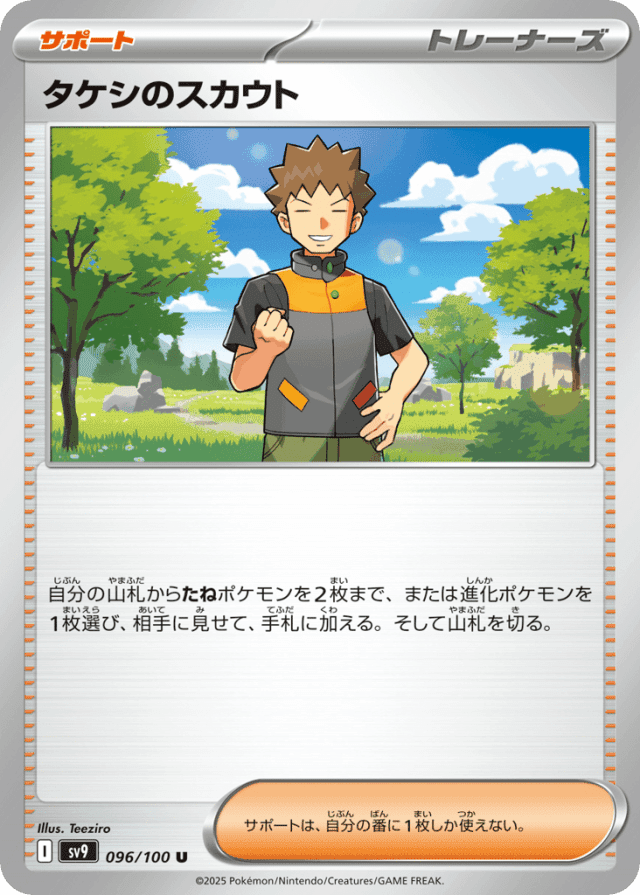 自分の山札からたねポケモンを2枚まで、または進化ポケモンを1枚選び、相手に見せて、手札に加える。そして山札を切る。 サポートは、自分の番に1枚しか使えない。