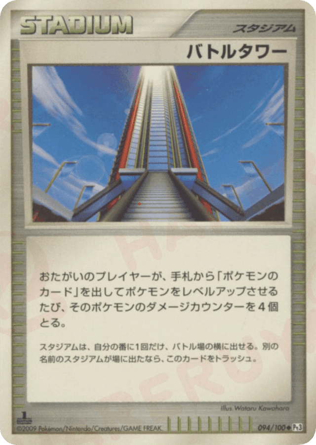 おたがいのプレイヤーが、手札から「ポケモンのカード」を出してポケモンをレベルアップさせるたび、そのポケモンのダメージカウンターを4個とる。 スタジアムは、自分の番に1枚だけ、バトル場の横に出せる。別の名前のスタジアムが場に出たなら、このカードをトラッシュする。