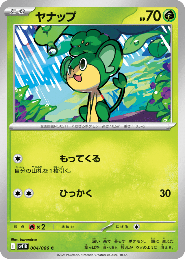 深い 森で 暮らす ポケモン。 頭に 生えた 葉っぱを 食べると 疲れが ウソのように 消える。