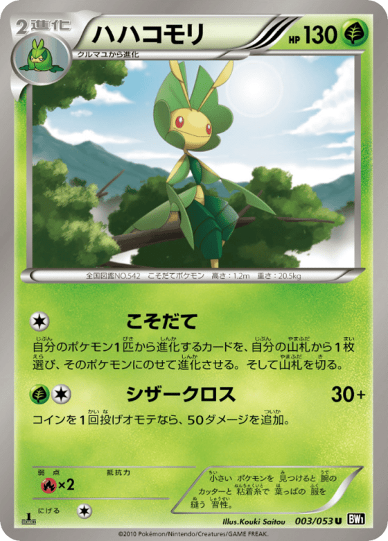 小さい ポケモンを 見つけると 腕の カッターと 粘着糸で 葉っぱの 服を 縫う 習性。