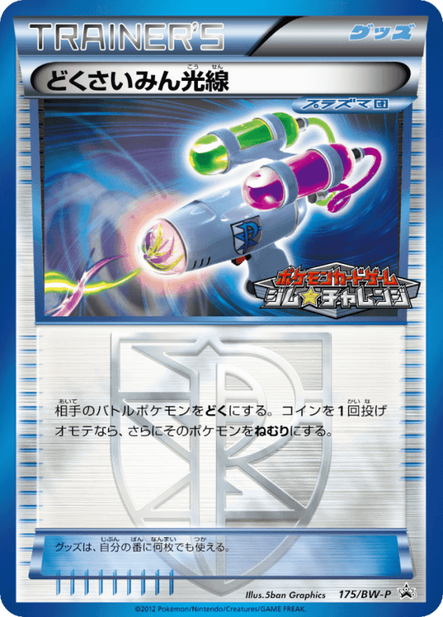 相手のバトルポケモンをどくにする。コインを1回投げオモテなら、さらにそのポケモンをねむりにする。 グッズは、自分の番に何枚でも使える。