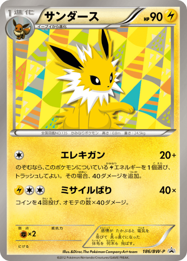 Electrigun20+Cost: 1のぞむなら、このポケモンについているLightningエネルギーを1個選び、トラッシュしてよい。その場合、40ダメージを追加。