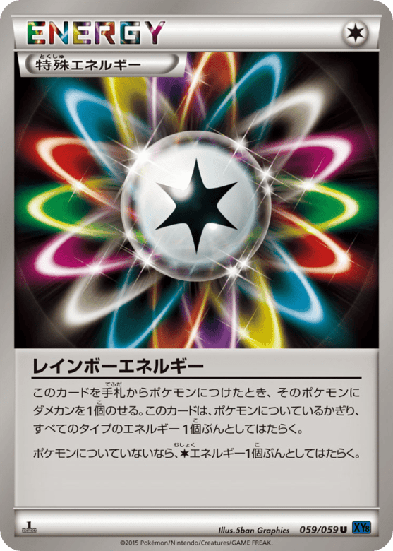 このカードを手札からポケモンにつけたとき、そのポケモンにダメカンを1個のせる。このカードは、ポケモンについているかぎり、すべてのタイプのエネルギー1個ぶんとしてはたらく。 ポケモンについていないなら、Colorlessエネルギー1個ぶんとしてはたらく。