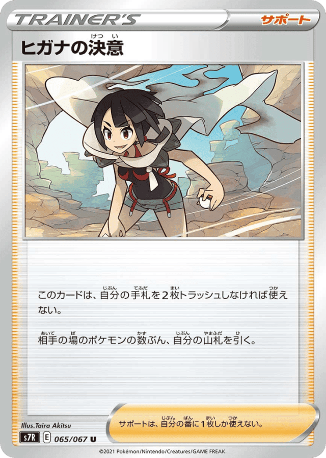 このカードは、自分の手札を2枚トラッシュしなければ使えない。 相手の場のポケモンの数ぶん、自分の山札を引く。 サポートは、自分の番に1枚しか使えない。