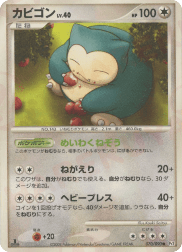 Flip a coin. If heads, this attack does 40 damage plus 40 more damage. If tails, Snorlax is now Asleep.