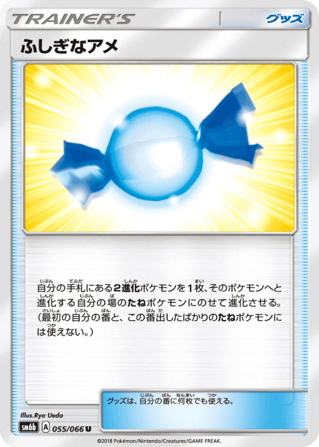 自分の手札にある2進化ポケモンを1枚、そのポケモンへと進化する自分の場のたねポケモンにのせて進化させる。(最初の自分の番と、この番出したばかりのたねポケモンには使えない。) グッズは、自分の番に何枚でも使える。