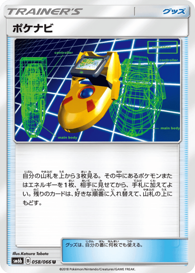 自分の山札を上から3枚見る。その中にあるポケモンまたはエネルギーを1枚、相手に見せてから、手札に加えてよい。残りのカードは、好きな順番に入れ替えて、山札の上にもどす。 グッズは、自分の番に何枚でも使える。