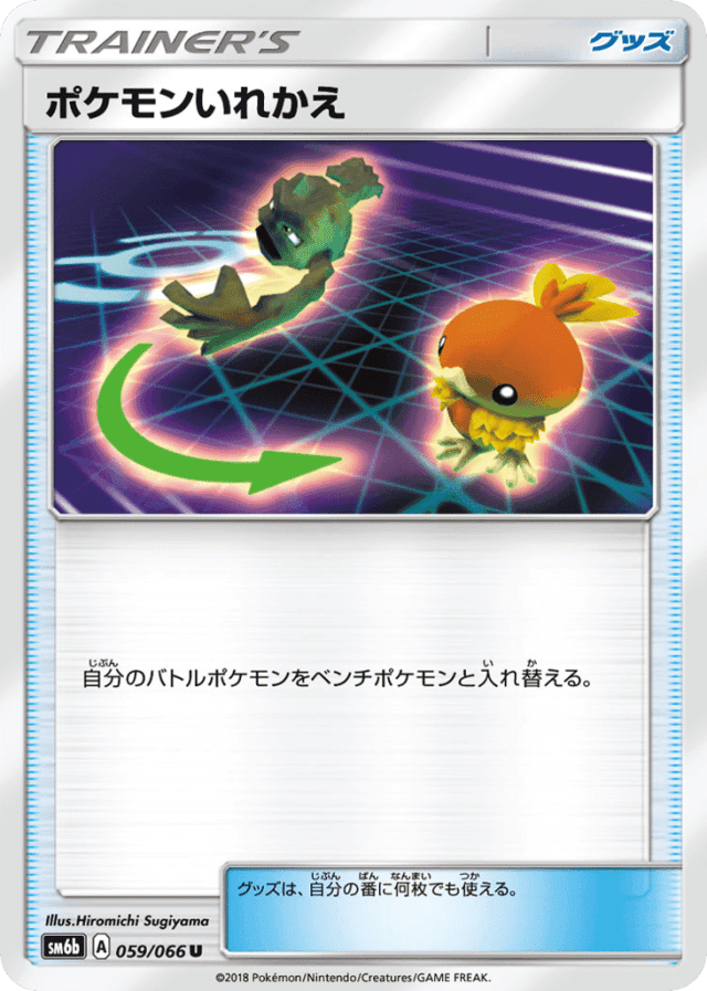自分のバトルポケモンをベンチポケモンと入れ替える。 グッズは、自分の番に何枚でも使える。