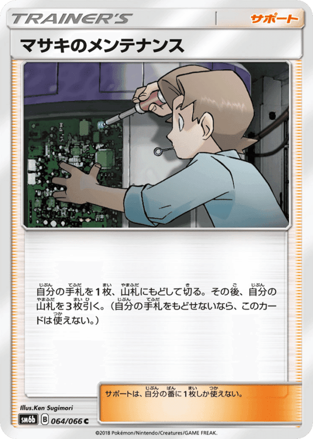 - 自分の手札を1枚、山札にもどして切る。その後、自分の山札を3枚引く。(自分の手札をもどせないなら、このカードは使えない。) — サポートは、自分の番に1枚しか使えない。