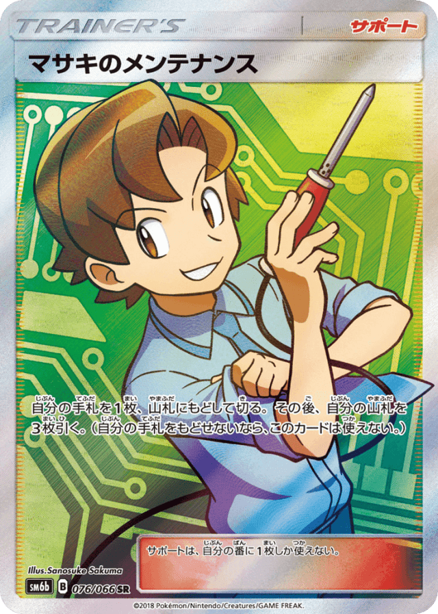 - 自分の手札を1枚、山札にもどして切る。その後、自分の山札を3枚引く。(自分の手札をもどせないなら、このカードは使えない。) — サポートは、自分の番に1枚しか使えない。