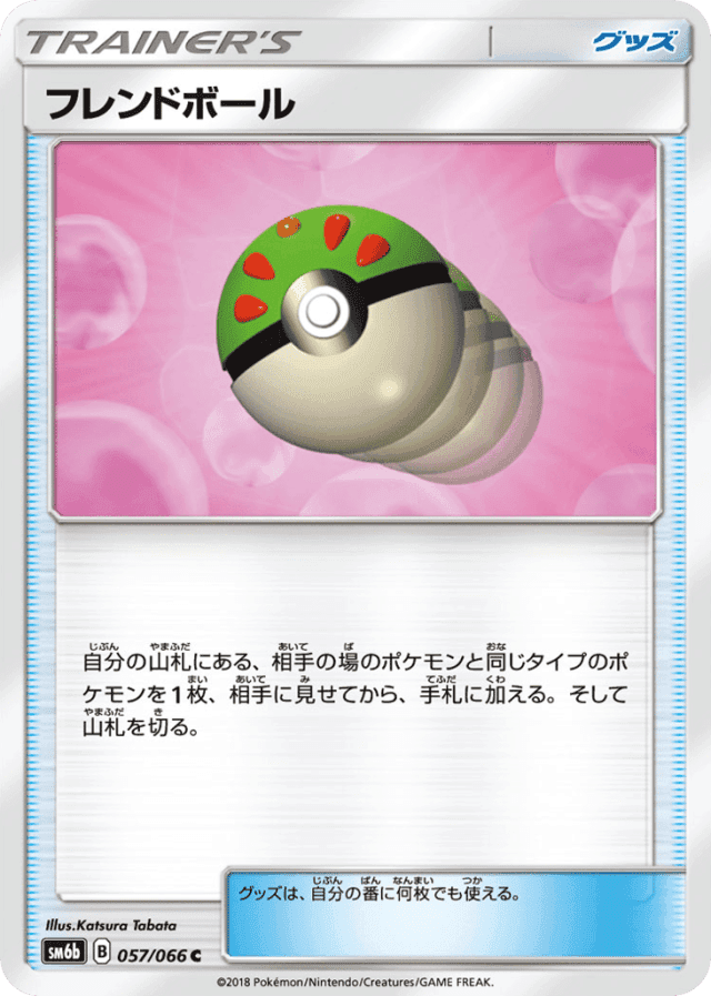 自分の山札にある、相手の場のポケモンと同じタイプのポケモンを1枚、相手に見せてから、手札に加える。そして山札を切る。 グッズは、自分の番に何枚でも使える。