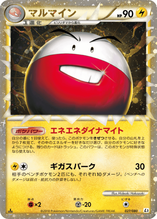 Once during your turn (before your attack), you may use this power. If you do, Electrode is Knocked Out. Look at the top 7 cards of your deck. Choose as many Energy cards as you like and attach them to your Pokémon in any way you like. Discard the other cards. This power can't be used if Electrode is affected by a Special Condition.