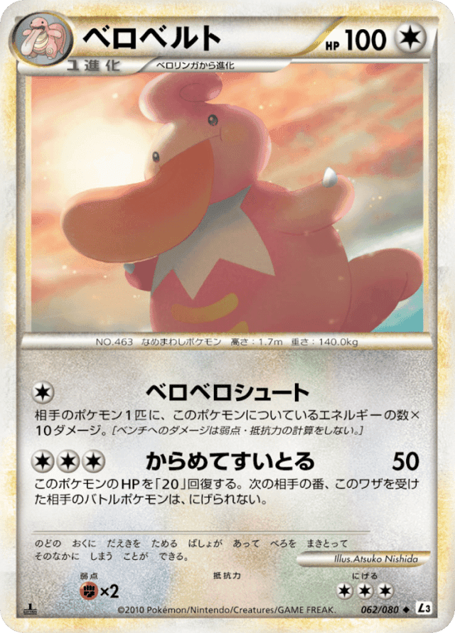 Licking ShotCost: 1相手のポケモン1匹に、このポケモンについているエネルギーの数×10ダメージ。[ベンチへのダメージは弱点・抵抗力の計算をしない。]