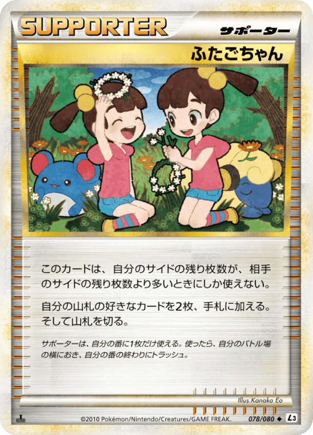 このカードは、自分のサイドの残り枚数が、相手のサイドの残り枚数より多いときにしか使えない。<br> 自分の山札の好きなカードを2枚、手札に加える。そして山札を切る。 サポートは、自分の番に1枚しか使えない。